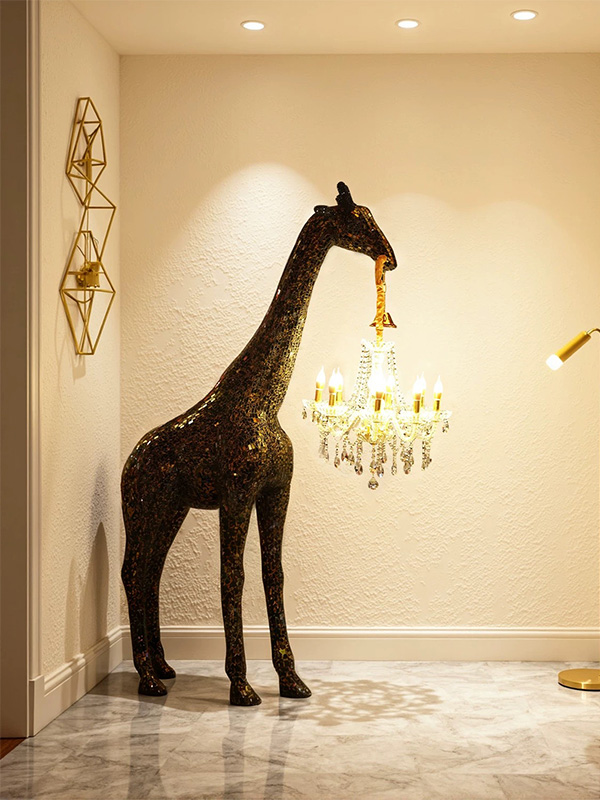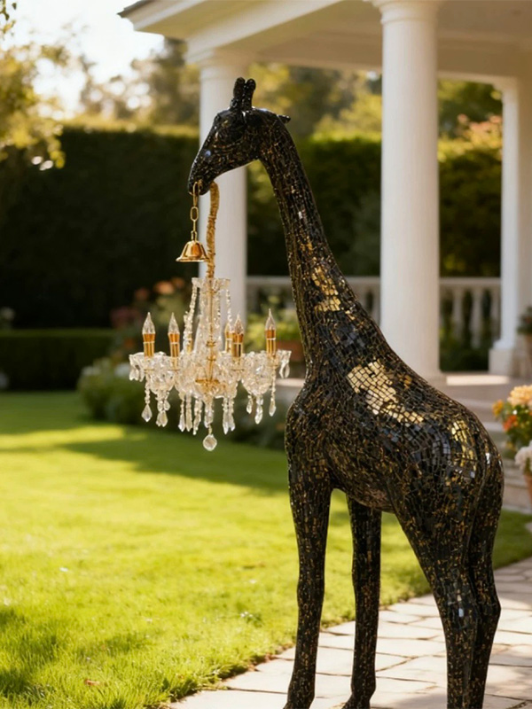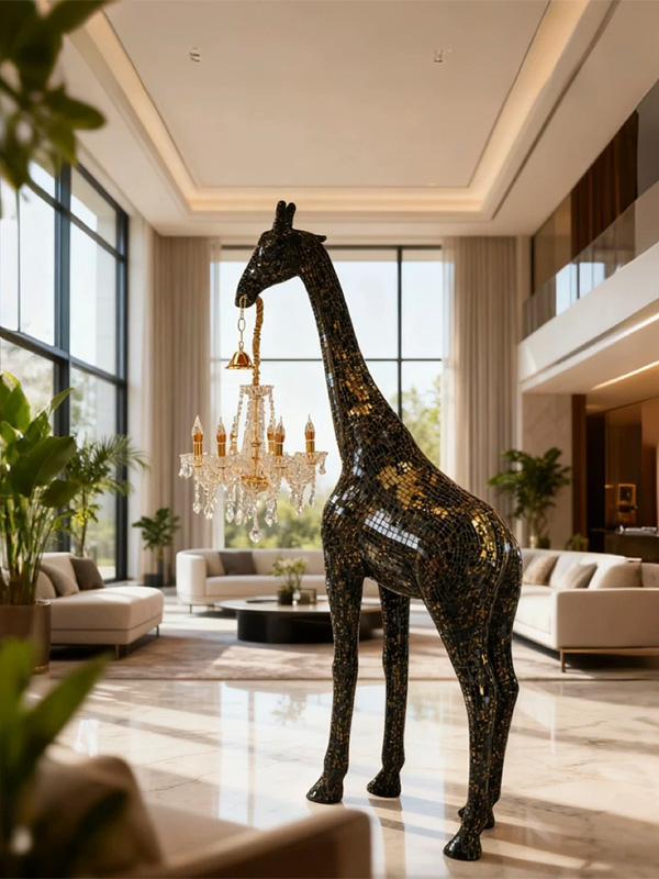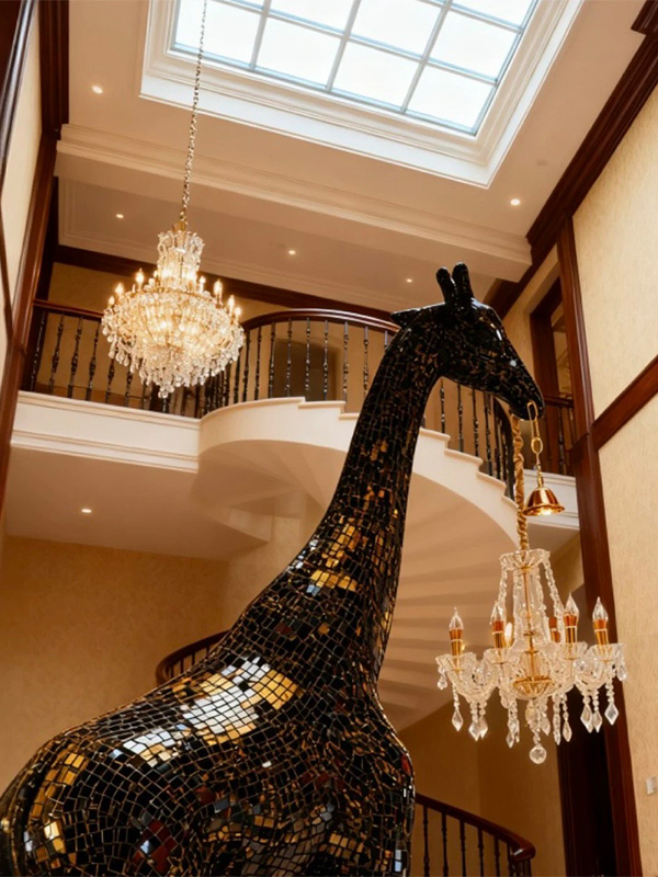 This mirror mosaic giraffeFloor Lamp Sculpture is designed for high-end interiors where both artistic expression and functional lighting are required. The reflective mosaic surface enhances illumination, making it an ideal feature piece for luxury hotels, commercial spaces, and art installations.