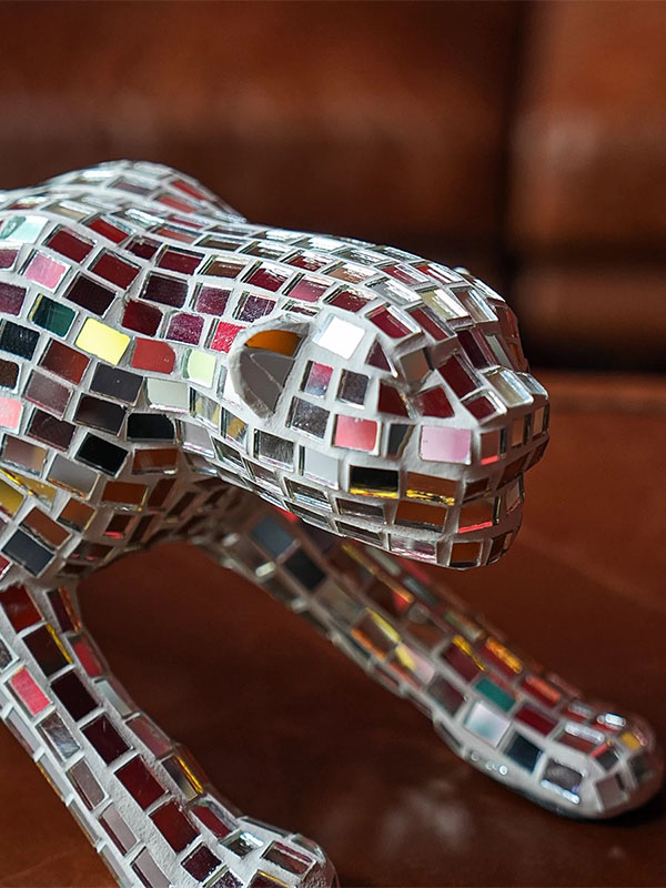This mirror mosaic leopard sculpture is built with a reinforced FRP (fiberglass) structure and finished with hand-applied mirror glass mosaic tiles. The reflective surface enhances lighting and spatial depth, making it an ideal decorative sculpture for shopping malls, hotels, exhibitions, and branded commercial spaces.