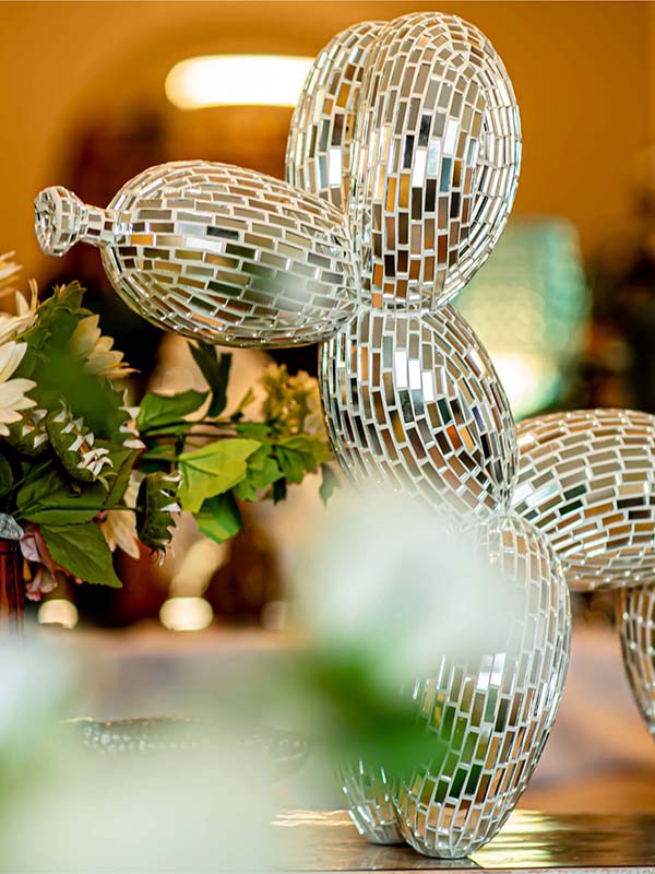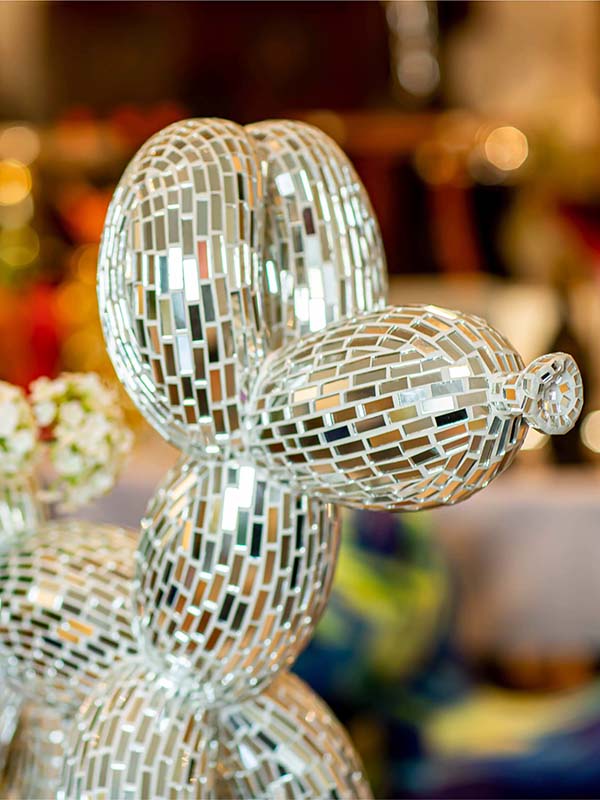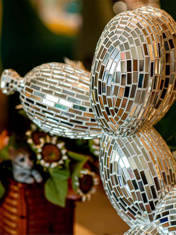 This mirror mosaic Balloon Dog Sculpture is a handcrafted decorative art piece designed and produced by our factory for commercial interior decoration and art installation projects.